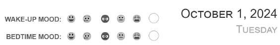 Additionally, the journal provides a simple way to track your mood upon waking and before sleeping, with options like Happy, Sad, Angry, Neutral, Tired, or a custom entry.