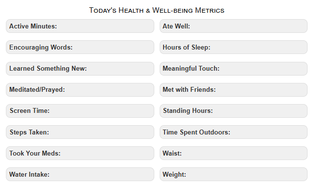 Beyond daily reflections, The MAIN Thing Journal includes a list of metrics to monitor various aspects of your well-being. You can choose to track some items daily and others occasionally, using them as reference points. For example, while I don't measure my waist daily, comparing last month's measurement to today's can indicate whether I should review my eating or excercise habits.